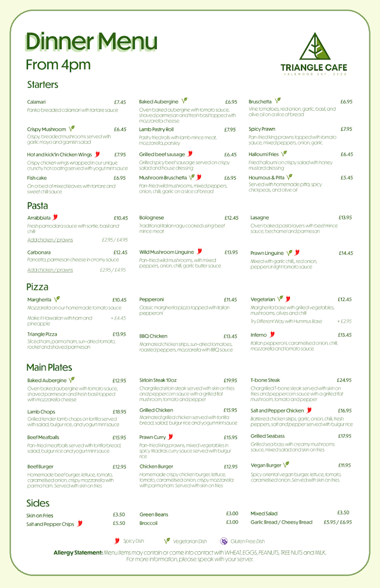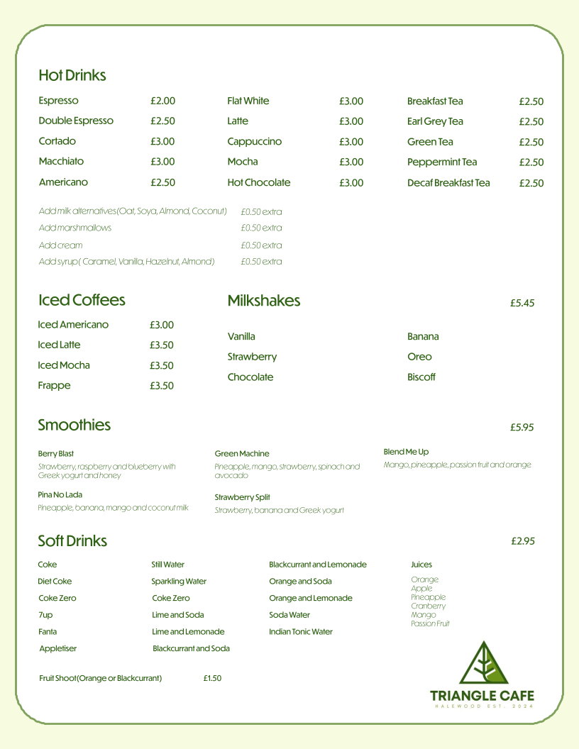Triangle Cafe offers a delicious selection of cuisine that caters to all tastes. If you’re in the mood for a hearty start to your day, don't miss their Small Triangle Breakfast, which showcases perfectly cooked crispy bacon, juicy sausages, and eggs that are cooked just right, all served with toast that pairs beautifully with their extensive range of hot drinks. Coffee connoisseurs will appreciate each cup, from a rich Espresso to a silky Flat White, expertly crafted to awaken your senses.